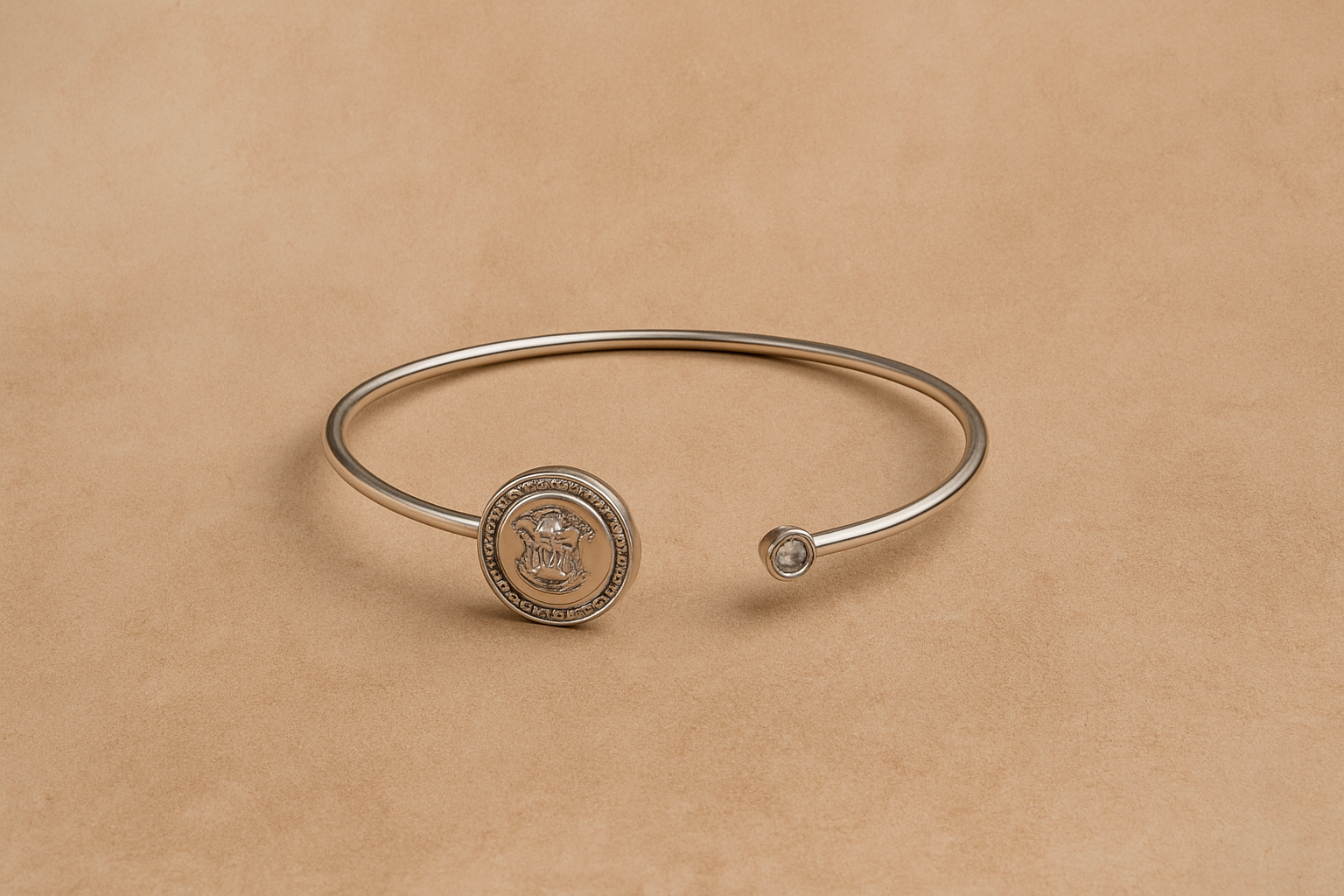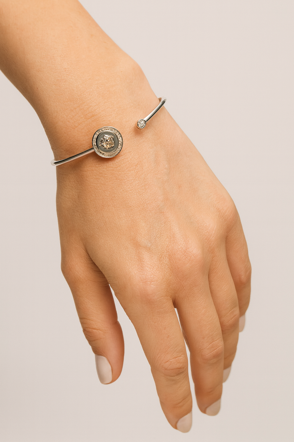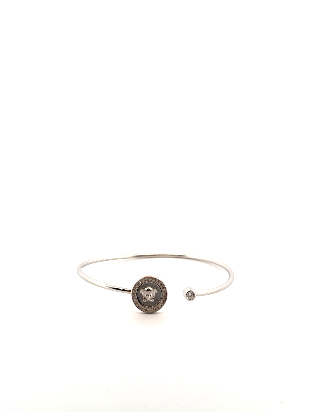 An iconic piece of modern sophistication — this slim rose gold bangle highlights a signature medallion with diamond accents, making it perfect for bold yet refined styling.